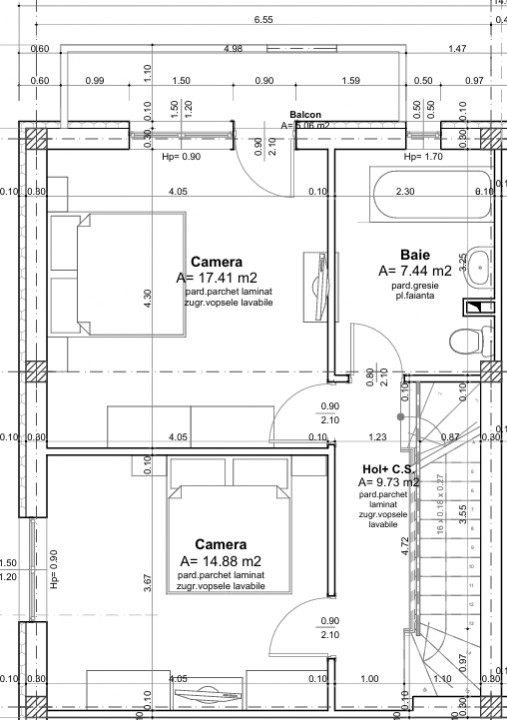 -La etaj, veți găsi: - 2 dormitoare - 1 baie-balcon