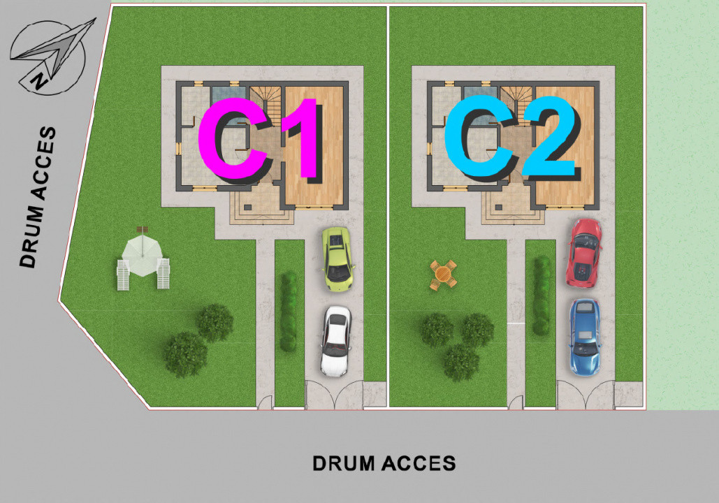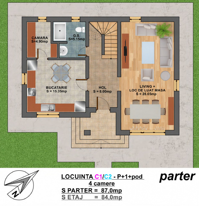 - *Parter:* Baie, bucătărie cu camera tehnica, living+dinning ,spațiu de depozitare