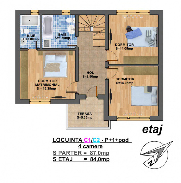 - *Etaj:* 3 dormitoare, dintre care 1 dormitor matrimonial cu baie proprie si balcon ,1 baie pe hol,