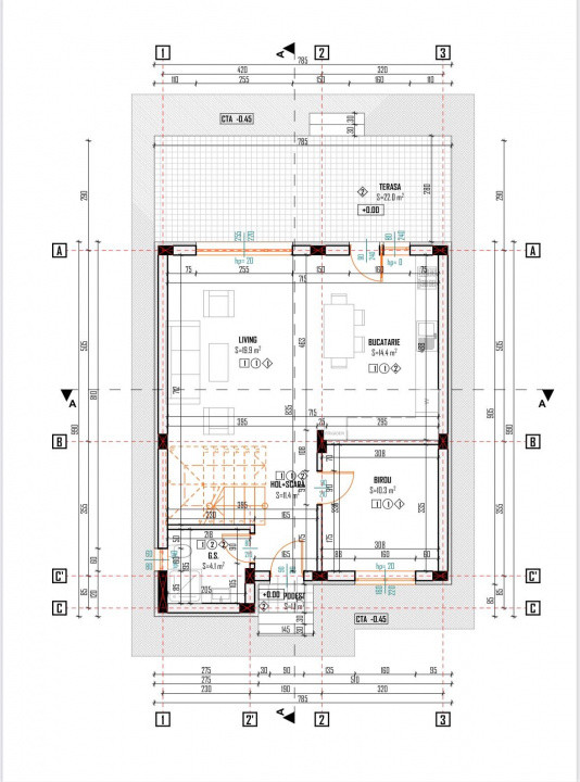 - *Parter:* ,Baie, bucătărie, living, spațiu de depozitare,dormitor,terasa